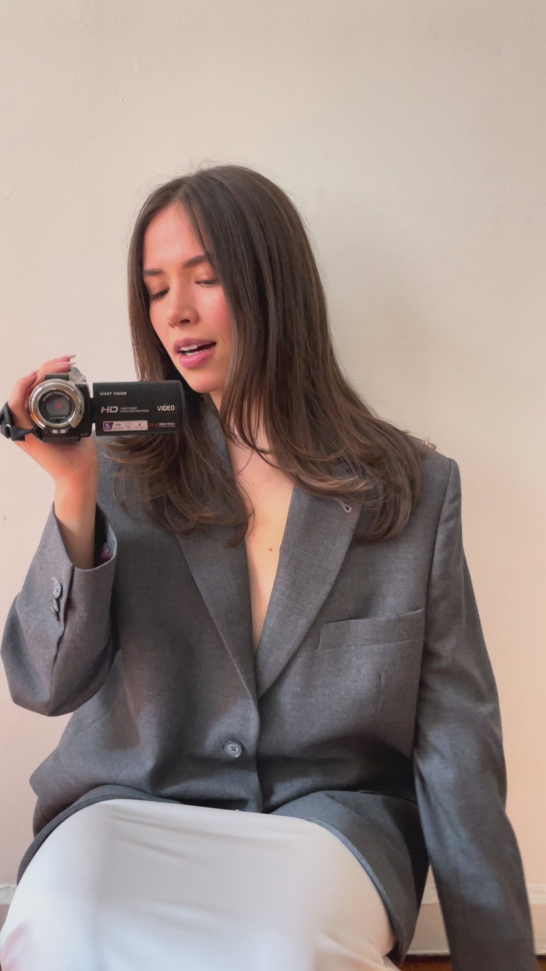 Tailored single-breasted oversized blazer with elongated silhouette, flap front and inside pockets, center back vent. Notch lapel. Two outside functional pockets.
