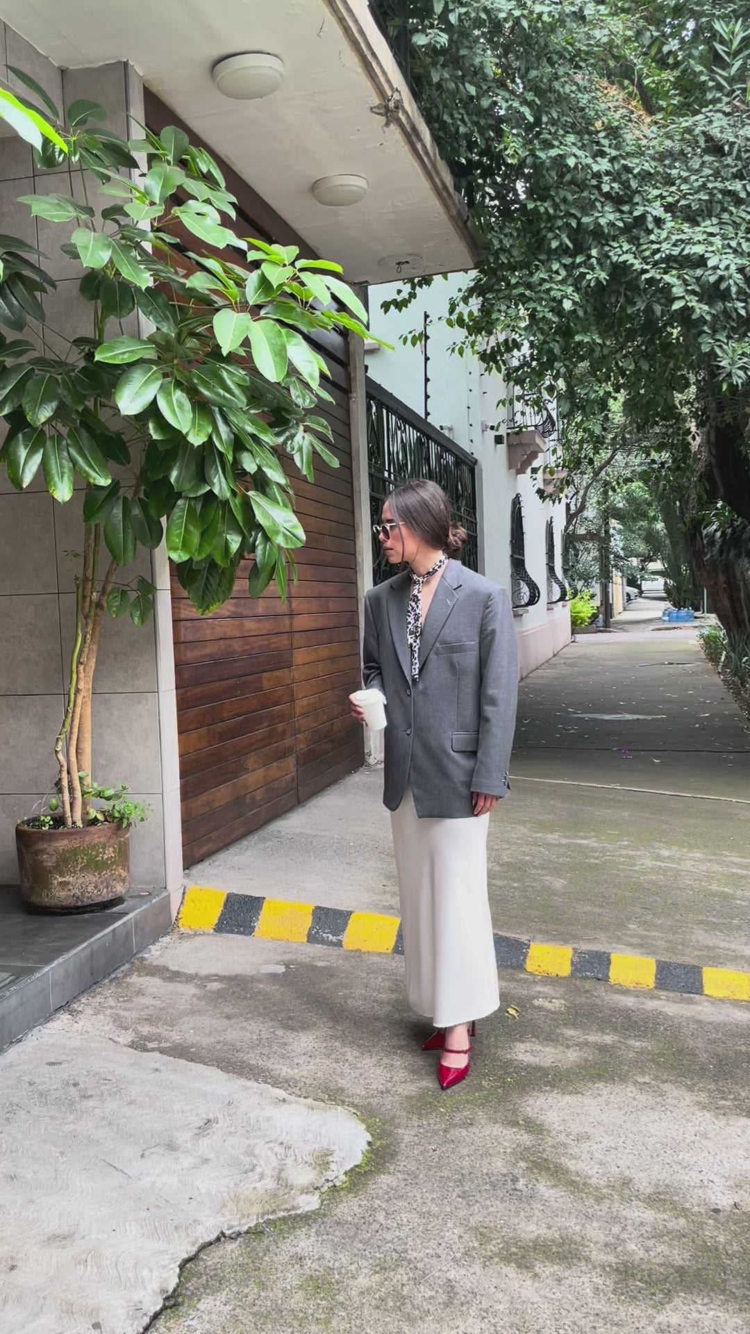 Tailored single-breasted oversized blazer with elongated silhouette, flap front and inside pockets, center back vent. Notch lapel. Two outside functional pockets.